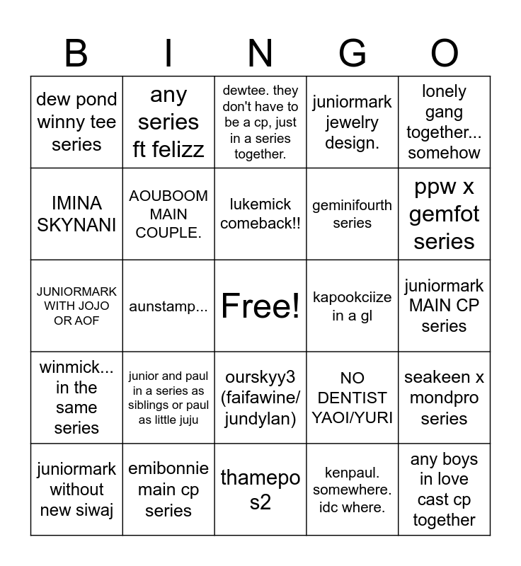 This bingo card has a free space and 24 words: junior and paul in a series as siblings or paul as little juju, emibonnie main cp series, lukemick comeback!!, juniormark without new siwaj, lonely gang together... somehow, dew pond winny tee series, IMINA SKYNANI, any series ft felizz, kapookciize in a gl, ourskyy3 (faifawine/ jundylan), geminifourth series, JUNIORMARK WITH JOJO OR AOF, NO DENTIST YAOI/YURI, seakeen x mondpro series, AOUBOOM MAIN COUPLE., kenpaul. somewhere. idc where., juniormark MAIN CP series, dewtee. they don't have to be a cp, just in a series together., ppw x gemfot series, aunstamp..., any boys in love cast cp together, winmick... in the same series, juniormark jewelry design. and thamepo s2.
