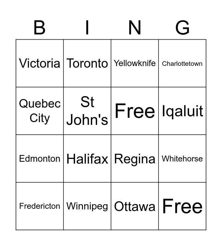 This bingo card has 16 words: Winnipeg, Whitehorse, Yellowknife, Victoria, Edmonton, Toronto, Regina, Ottawa, Quebec City, St John's, Fredericton, Charlottetown, Halifax, Iqaluit, Free and Free.