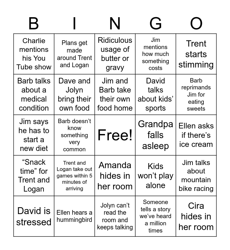 This bingo card has a free space and 24 words: Trent and Logan take out games within 5 minutes of arriving, Ellen hears a hummingbird, Jim and Barb take their own food home, David is stressed, Trent starts stimming, Charlie mentions his You Tube show, Barb talks about a medical condition, Plans get made around Trent and Logan, Grandpa falls asleep, Amanda hides in her room, David talks about kids’ sports, Jim says he has to start a new diet, Kids won’t play alone, Jim talks about mountain bike racing, Dave and Jolyn bring their own food, Someone tells a story we’ve heard a million times, Ellen asks if there’s ice cream, Ridiculous usage of butter or gravy, Barb reprimands Jim for eating sweets, Barb doesn’t know something very common, Cira hides in her room, “Snack time” for Trent and Logan, Jim mentions how much something costs and Jolyn can’t read the room and keeps talking.