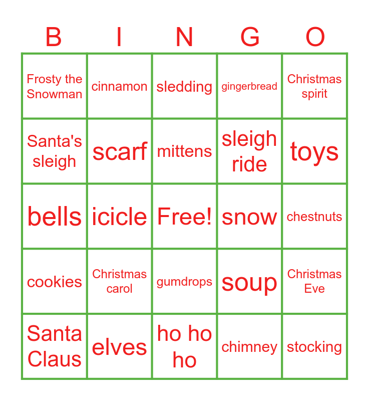 This bingo card has a free space and 54 words: gifts, cookies, Santa's workshop, hot chocolate, gumdrops, reindeer, gingerbread, house, Santa's sleigh, eggnog, Frosty the Snowman, candy cane, elves, Santa Claus, pumpkin pie, ho ho ho, stocking, sleigh ride, Buddy the Elf, chestnuts, soup, snowman, snow, Christmas spirit, jingle bells, cinnamon, snowball fight, decorations, snowflake, chimney, Jack Frost, Christmas break, star, Rudolph, sledding, ice skating, bells, Christmas Eve, little drummer boy, scarf, lights, doll, the Grinch, Nutcracker, Christmas carol, the North Pole, mistletoe, turkey, mittens, icicle, toys, Christmas tree, wrapping paper and menorah.