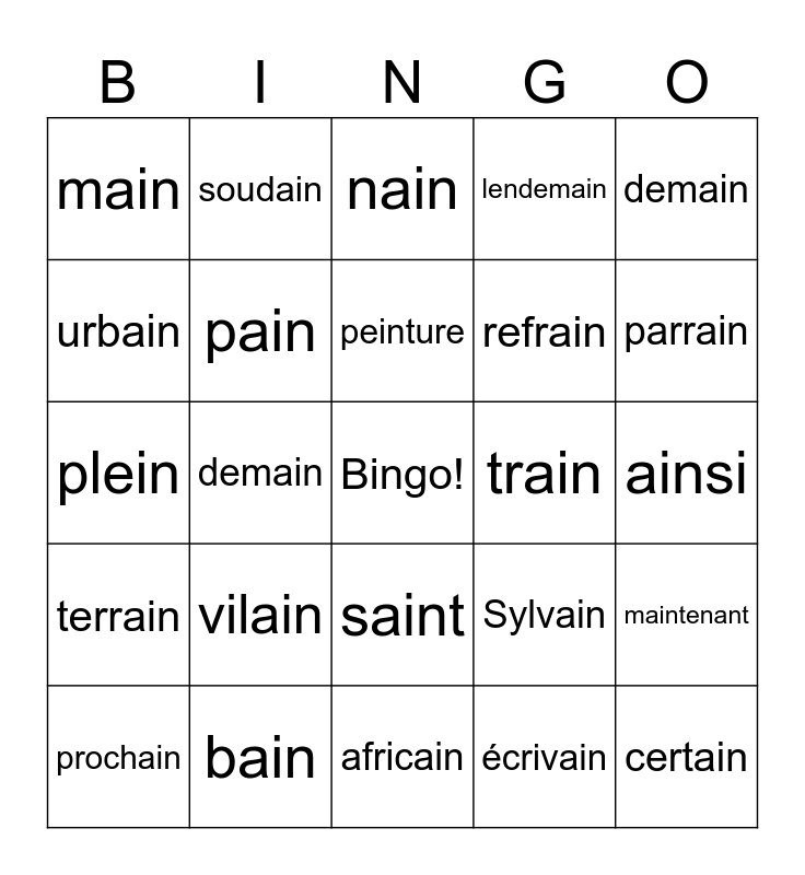 This bingo card has a free space and 30 words: bain, copain, demain, grain, main, nain, pain, saint, train, africain, ainsi, certain, écrivain, lointain, parrain, plainte, Sylvain, terrain, vilain, demain, plein, humain, soudain, refrain, urbain, lendemain, maintenant, prochain, peinture and ceinture.