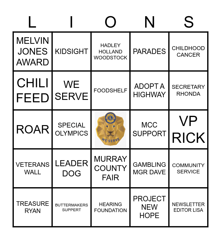 This bingo card has a free space and 49 words: DISTRICT 5M3, NEWSLETTER EDITOR LISA, DIABETES FOUNDATION, HEARING FOUNDATION, LEADER DOG, CAN DO CANINES, KIDSIGHT, LCIF, CHILI FEED, BASEBALL TOURNY, WE SERVE, PARADES, COMMUNITY SERVICE, GAMBLING MGR DAVE, TAILTWISTER SHARON, MEALS ON WHEELS, FOODSHELF, MCC SUPPORT, CHRISTMAS PROJECT, CHILDHOOD CANCER, SPECIAL OLYMPICS, PROJECT NEW HOPE, MELVIN JONES AWARD, ADOPT A HIGHWAY, PRESIDENT RILEY, SECRETARY RHONDA, TREASURE RYAN, KJOE CHRISTMAS CAROL, MURRAY COUNTY FAIR, VETERANS WALL, CHARITABLE DONATION, MIDWINTER CONVENTION, TRUNK OR TREAT, FAMILY FAIR, BUTTERMAKERS SUPPERT, PULLTABS, E-TABS, PARADE OF GREEN, VP RICK, EYEGLASS DONATION, LIGHTUP GULLARD, PEACE POSTER, SLAYTON SUMMER REC, 1.4M MEMBERS GLOBAL, ROAR, HADLEY HOLLAND WOODSTOCK, 2DVG DARREN, CHEVRON AWARD and MEMBERSHIP KEY AWARD.