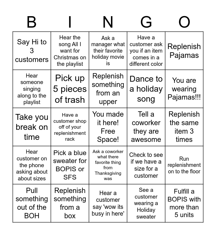 This bingo card has a free space and 24 words: Pick a blue sweater for BOPIS or SFS, Replenish something from a box, Replenish something from an upper, Pull something out of the BOH, Replenish Pajamas, Say Hi to 3 customers, Hear someone singing along to the playlist, Hear the song All I want for Christmas on the playlist, Tell a coworker they are awesome, Ask a coworker what there favorite thing from Thanksgiving was, Dance to a holiday song, Take you break on time, Check to see if we have a size for a customer, Run replenishment on to the floor, Pick up 5 pieces of trash, See a customer wearing a Holiday sweater, Replenish the same item 3 times, Ask a manager what their favorite holiday movie is, You are wearing Pajamas!!!, Have a customer shop off of your replenishment rack, Fulfill a BOPIS with more than 5 units, Hear customer on the phone asking about about sizes, Have a customer ask you if an item comes in a different color and Hear a customer say 'wow its busy in here'.