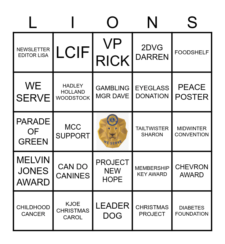 This bingo card has a free space and 49 words: BASEBALL TOURNY, DIABETES FOUNDATION, HEARING FOUNDATION, LEADER DOG, CAN DO CANINES, KIDSIGHT, LCIF, CHILI FEED, WE SERVE, ROAR, HADLEY HOLLAND WOODSTOCK, 2DVG DARREN, CHEVRON AWARD, MEMBERSHIP KEY AWARD, PARADES, COMMUNITY SERVICE, GAMBLING MGR DAVE, TAILTWISTER SHARON, MEALS ON WHEELS, FOODSHELF, MCC SUPPORT, CHRISTMAS PROJECT, NEWSLETTER EDITOR LISA, EYEGLASS DONATION, LIGHTUP GULLARD, PEACE POSTER, CHILDHOOD CANCER, SPECIAL OLYMPICS, PROJECT NEW HOPE, MELVIN JONES AWARD, ADOPT A HIGHWAY, PRESIDENT RILEY, SECRETARY RHONDA, TREASURE RYAN, KJOE CHRISTMAS CAROL, MURRAY COUNTY FAIR, VETERANS WALL, CHARITABLE DONATION, MIDWINTER CONVENTION, TRUNK OR TREAT, FAMILY FAIR, BUTTERMAKERS SUPPERT, PULLTABS, E-TABS, PARADE OF GREEN, VP RICK, DISTRICT 5M3, SLAYTON SUMMER REC and 1.4M MEMBERS GLOBAL.