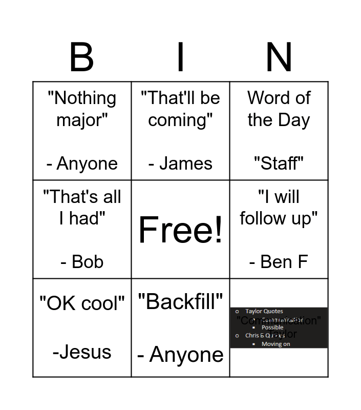 This bingo card has 1 images, a free space and 21 words: "Looking to get X's input on that." - Chris H, "Everything's on track" - Bob, "That'll be coming" - James, "Not a whole lot" - Ben F, "I will keep it short" - Baofu, "OK cool" -Jesus, "Nothing major" - Anyone, Word of the Day "Staff", "Expecting" - Chris H, "Backfill" - Anyone, "Still owe" - Bob, "That's all I had" - Bob, "We have a spike" - James, "Resources are leveled" - James, "I will follow up" - Ben F, "Happy Monday" - Anyone, "PTO" - Anyone, "Calendar" - Anyone, "Communication" - Taylor, "Possible" - Taylor and "Moving on" - Chris B.