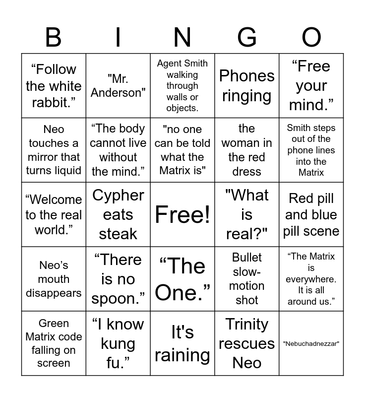 This bingo card has a free space and 24 words: “There is no spoon.”, “I know kung fu.”, "no one can be told what the Matrix is", Green Matrix code falling on screen, “Free your mind.”, “Follow the white rabbit.”, Neo touches a mirror that turns liquid, "Mr. Anderson", "What is real?", “The One.”, the woman in the red dress, “Welcome to the real world.”, Bullet slow-motion shot, “The Matrix is everywhere. It is all around us.”, “The body cannot live without the mind.”, Trinity rescues Neo, Red pill and blue pill scene, Agent Smith walking through walls or objects., Smith steps out of the phone lines into the Matrix, Cypher eats steak, "Nebuchadnezzar", Neo’s mouth disappears, Phones ringing and It's raining.