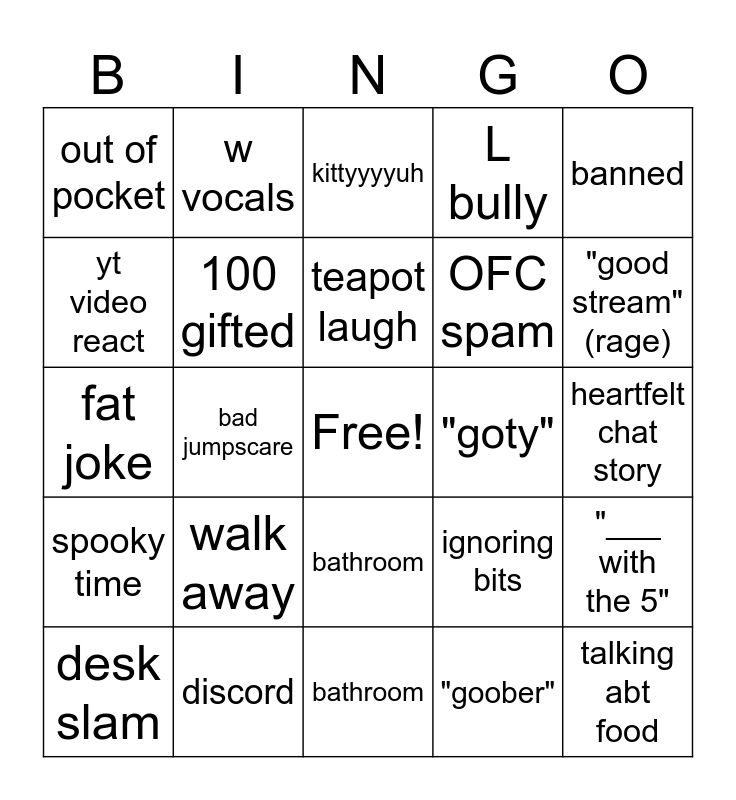 This bingo card has a free space and 24 words: desk slam, walk away, teapot laugh, "goober", banned, out of pocket, w vocals, kittyyyyuh, "goty", heartfelt chat story, fat joke, 100 gifted, ignoring bits, "___ with the 5", yt video react, discord, bathroom, L bully, "good stream" (rage), spooky time, bad jumpscare, bathroom, OFC spam and talking abt food.