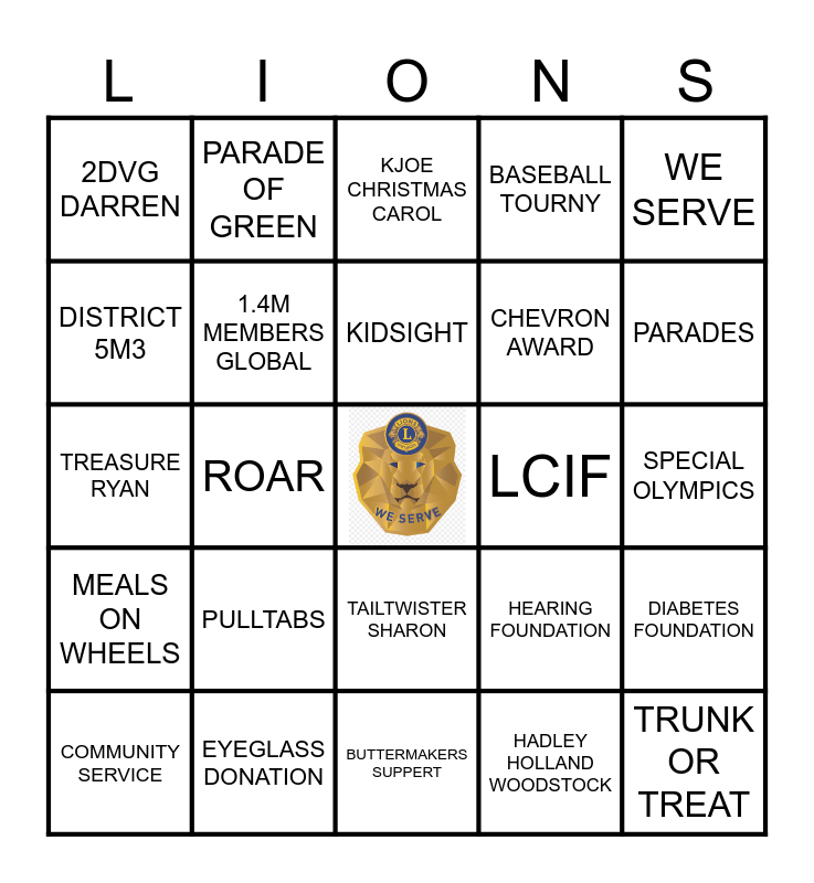 This bingo card has a free space and 49 words: MIDWINTER CONVENTION, TRUNK OR TREAT, FAMILY FAIR, BUTTERMAKERS SUPPERT, PULLTABS, E-TABS, PARADE OF GREEN, VP RICK, DISTRICT 5M3, SLAYTON SUMMER REC, 1.4M MEMBERS GLOBAL, BASEBALL TOURNY, DIABETES FOUNDATION, HEARING FOUNDATION, LEADER DOG, CAN DO CANINES, KIDSIGHT, LCIF, CHILI FEED, WE SERVE, ROAR, HADLEY HOLLAND WOODSTOCK, 2DVG DARREN, CHEVRON AWARD, MEMBERSHIP KEY AWARD, PARADES, COMMUNITY SERVICE, GAMBLING MGR DAVE, TAILTWISTER SHARON, MEALS ON WHEELS, FOODSHELF, MCC SUPPORT, CHRISTMAS PROJECT, NEWSLETTER EDITOR LISA, EYEGLASS DONATION, LIGHTUP GULLARD, PEACE POSTER, CHILDHOOD CANCER, SPECIAL OLYMPICS, PROJECT NEW HOPE, MELVIN JONES AWARD, ADOPT A HIGHWAY, PRESIDENT RILEY, SECRETARY RHONDA, TREASURE RYAN, KJOE CHRISTMAS CAROL, MURRAY COUNTY FAIR, VETERANS WALL and CHARITABLE DONATION.