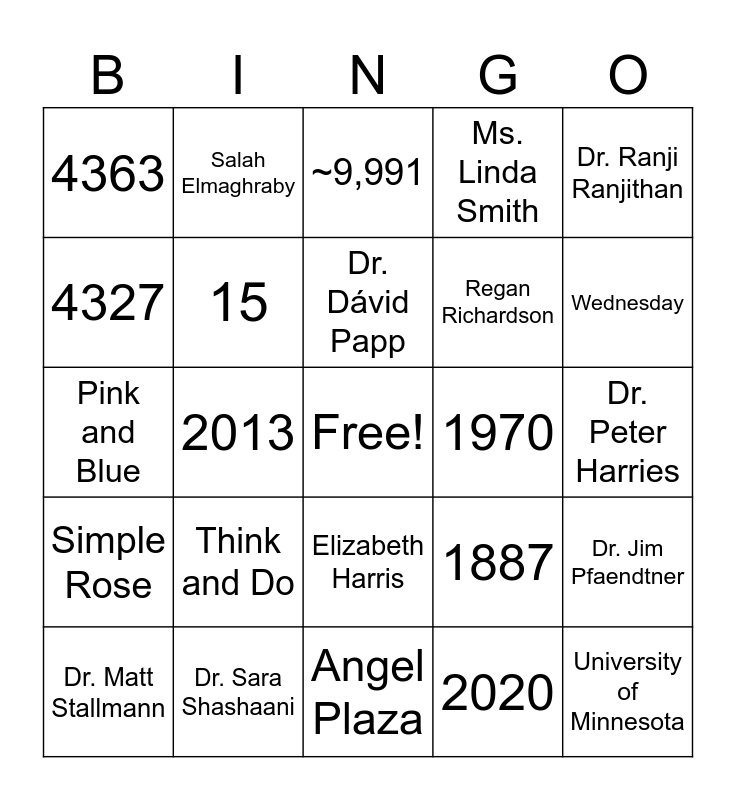 This bingo card has a free space and 24 words: Think and Do, Dr. Sara Shashaani, Dr. Dávid Papp, Dr. Matt Stallmann, Dr. Ranji Ranjithan, 4363, 4327, Salah Elmaghraby, 1970, Elizabeth Harris, Regan Richardson, Pink and Blue, 1887, Dr. Jim Pfaendtner, 15, 2020, Dr. Peter Harries, ~9,991, Wednesday, 2013, University of Minnesota, Simple Rose, Ms. Linda Smith and Angel Plaza.