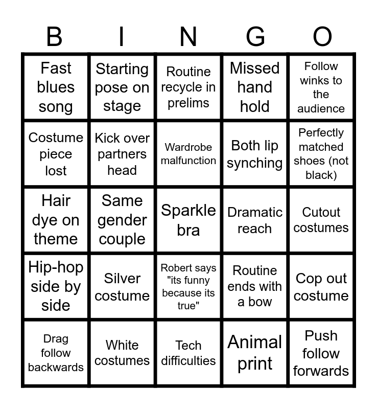 This bingo card has a free space and 87 words: Robert says "Our Next Couple", Robert almost drops the mic, Robert says "its funny because its true", Robert reads a shout-out from your state, Robert says "yeah yeah yeah", Robert talks about NASDE, Someone takes the mic from Robert, Robert needs pronunciation help, Robert starts losing his voice, Robert asks the crowd to make a little more noise, Robert reminisces, Guyliner, Cop out costume, Cutout costumes, Bowtie costume, Wardrobe malfunction, Costume with shorts, Excessive fringe, Costume reveal, Costume with boots, Dancing in high heels, Unnecessarily sexy follow, Hair dye on theme, Turtleneck costume, Animal print, Costume with a dress, Dead faced lead, Red costumes, Blue costumes, Green costumes, White costumes, Velvet costume, Gold costume, Silver costume, Costume piece lost, Pinstripes, Perfectly matched shoes (not black), Sparkles in hair, Couple kisses before the routine starts, Same gender couple, Masters couple goals, Finger guns, “Make some noiseâ€, Dramatic reach, Lead winks to the audience, Follow winks to the audience, Dramatic opening sequence before music, Starting pose on stage, Accidental lift in classic, Celebratory arm pumps before the music stops, Showcase botched lift, Dramatic slow look up, Hip-hop side by side, Lindy easter egg move, Knee slide, Splits, Both lip synching, Looks of pain, Snake under leg, Missed hand hold, Kick over partners head, Chugs to the audience, Airplane arms, Bicep curl, Look at my crotch lift, Tatiana toe rise, Standing splits, Drag follow backwards, Push follow forwards, Unexpected couple makes classic finals, Someone does both Classic and Showcase, Unexpected pairing of pros, Routine recycle in prelims, Routine ends with a bow, Standing ovation, Someone cries, Unhappy walk off, Tech difficulties, Same song/tempo change, Same song/Original+acoustic, Movie theme song, Showtunes, Two song routine, Three song routine, New couple same song, Fast blues song and Slow blues song.