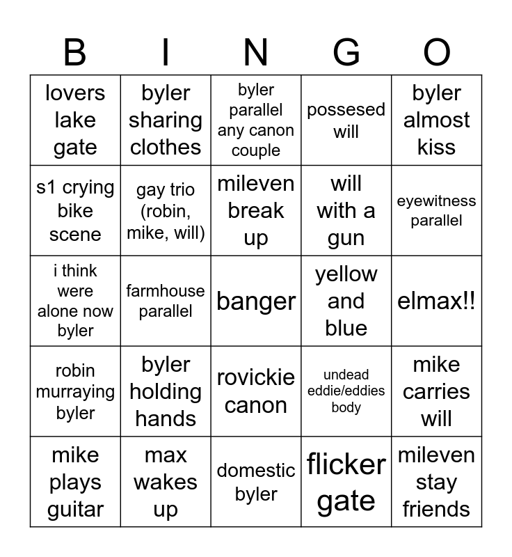 This bingo card has a free space and 24 words: byler holding hands, max wakes up, mileven break up, mike plays guitar, byler almost kiss, lovers lake gate, s1 crying bike scene, byler sharing clothes, yellow and blue, rovickie canon, will with a gun, i think were alone now byler, undead eddie/eddies body, mike carries will, gay trio (robin, mike, will), flicker gate, elmax!!, byler parallel any canon couple, eyewitness parallel, farmhouse parallel, mileven stay friends, robin murraying byler, possesed will and domestic byler.