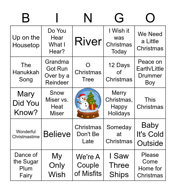 This bingo card has a free space and 40 words: Christmas Wrapping, Mary Did You Know?, Christmas (Baby Please Come Home), Grandma Got Run Over by a Reindeer, My Only Wish, Christmas Don't Be Late, O Christmas Tree, When Christmas Comes to Town, We Need a Little Christmas, Wonderful Christmastime, Snow Miser vs. Heat Miser, I Wish it was Christmas Today, Please Come Home for Christmas, This Christmas, Merry Christmas, Happy Holidays, Believe, Santa Claus is Coming to Town, Up on the Housetop, Little St. Nick, River, Baby It's Cold Outside, I Saw Three Ships, 12 Days of Christmas, The Hanukkah Song, No. 2 March, Hard Candy Christmas, Silver and Gold, What Christmas Means to Me, My Favorite Things, Where Are you Christmas?, Happy Xmas (War is Over), Dance of the Sugar Plum Fairy, I'm Gettin' Nuttin' for Christmas, Someday at Christmas, Peace on Earth/Little Drummer Boy, We're A Couple of Misfits, (Everybody's Waitin' For) The Man with the Bag, Santa Tell Me, Do You Hear What I Hear? and The Bells of Christmas.