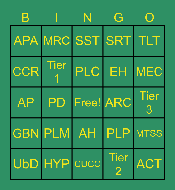 This bingo card has a free space and 24 words: PLM, HYP, PLC, UbD, TLT, APA, CCR, MRC, ARC, AH, EH, AP, PLP, MTSS, Tier 1, Tier 2, Tier 3, SST, MEC, PD, ACT, GBN, SRT and CUCC.
