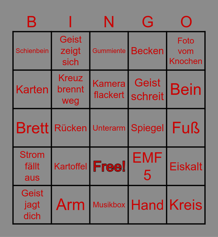 This bingo card has 29 words: Free!, Kopf, Rücken, Brust, Becken, Bein, Schienbein, Arm, Unterarm, Hand, Fuß, Karten, Puppe, Musikbox, Spiegel, Kreis, Brett, Kartoffel, Gummiente, EMF 5, Eiskalt, Geist jagt dich, Kreuz brennt weg, Kamera flackert, Geist schreit, Foto vom Knochen, Strom fällt aus, Geist zeigt sich and Spirit Box antwortet.