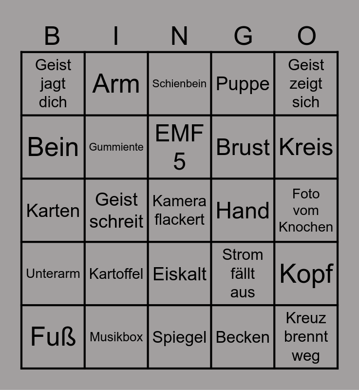 This bingo card has 28 words: Kopf, Rücken, Brust, Becken, Bein, Schienbein, Arm, Unterarm, Hand, Fuß, Karten, Puppe, Musikbox, Spiegel, Kreis, Brett, Kartoffel, Gummiente, EMF 5, Eiskalt, Geist jagt dich, Kreuz brennt weg, Kamera flackert, Geist schreit, Foto vom Knochen, Strom fällt aus, Geist zeigt sich and Spirit Box antwortet.