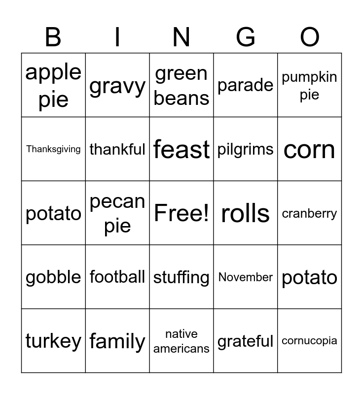This bingo card has a free space and 24 words: football, family, feast, turkey, pumpkin pie, apple pie, Thanksgiving, gravy, rolls, stuffing, pilgrims, potato, November, potato, thankful, grateful, cranberry, green beans, corn, pecan pie, cornucopia, gobble, parade and native americans.