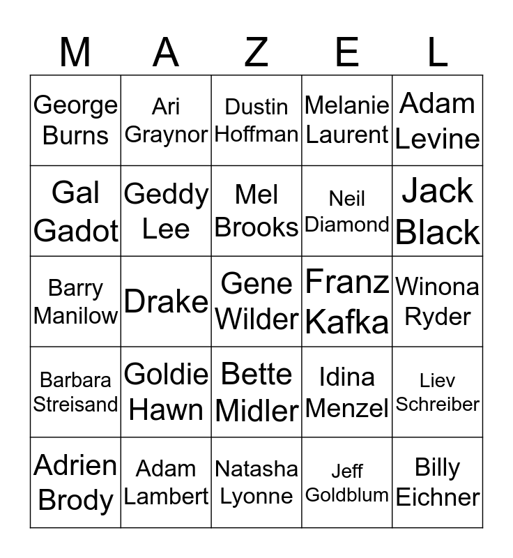 This bingo card has 30 words: Adam Lambert, Amy Sedaris, Drake, Fran Drescher, George Burns, Dustin Hoffman, Geddy Lee, Bette Midler, Franz Kafka, Natasha Lyonne, Winona Ryder, Gene Wilder, Jeff Goldblum, Billy Eichner, Jack Black, Mandy Patinkin, Idina Menzel, Barbara Streisand, Goldie Hawn, Adam Levine, Barry Manilow, Sergey Brin, Ari Graynor, Neil Diamond, Gal Gadot, Melanie Laurent, Liev Schreiber, Adrien Brody, Mel Brooks and Elizabeth Banks.