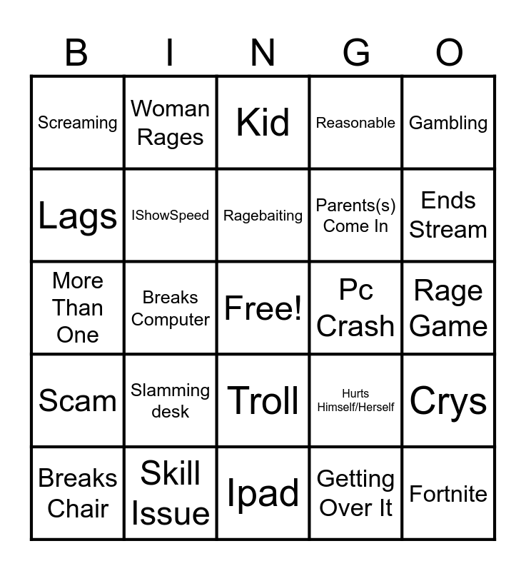 This bingo card has a free space and 29 words: Breaks Chair, Breaks Mouse, Breaks Computer, Cuss Word, Screaming, Kid, IShowSpeed, Slamming desk, Pc Crash, Skill Issue, Rage Game, Fortnite, Ipad, Getting Over It, Ends Stream, Ends Video, Troll, Scam, Gambling, More Than One, Hurts Himself/Herself, Phone, Parents(s) Come In, Lags, Reasonable, Woman Rages, Crys, Ragebaiting and Wenatic.