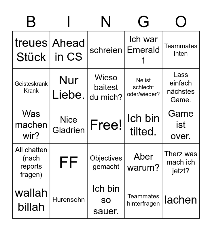 This bingo card has a free space and 24 words: FF, Hurensohn, Wieso baitest du mich?, wallah billah, Teammates inten, treues Stück, Geisteskrank Krank, Ahead in CS, Ich bin tilted., Objectives gemacht, Ne ist schlecht oder/wieder?, Was machen wir?, Aber warum?, Therz was mach ich jetzt?, Nur Liebe., Teammates hinterfragen, Game ist over., schreien, Lass einfach nächstes Game., Nice Gladrien, lachen, All chatten (nach reports fragen), Ich war Emerald 1 and Ich bin so sauer..