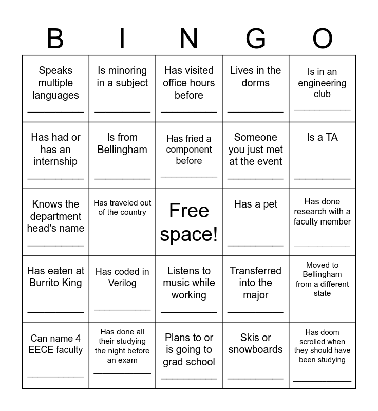 This bingo card has a free space and 24 words: Has coded in Verilog ___________, Has done all their studying the night before an exam _____________, Has fried a component before ___________, Can name 4 EECE faculty ___________, Is in an engineering club ___________, Speaks multiple languages __________, Has had or has an internship __________, Is minoring in a subject __________, Has a pet __________, Listens to music while working __________, Someone you just met at the event __________, Knows the department head's name __________, Transferred into the major __________, Moved to Bellingham from a different state ____________, Is from Bellingham __________, Skis or snowboards __________, Has done research with a faculty member ____________, Has visited office hours before __________, Is a TA __________, Has traveled out of the country _____________, Has doom scrolled when they should have been studying ______________, Has eaten at Burrito King __________, Lives in the dorms __________ and Plans to or is going to grad school __________.