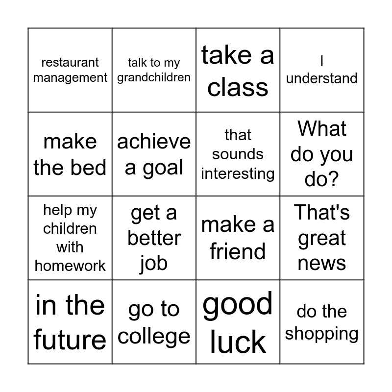 This bingo card has 30 words: Oh, no!, Tell me more, That's great news, That's too bad, restaurant management, take a class, that sounds interesting, I see, go to college, open my own business, good luck, in the future, set a goal, become an American citizen, get a better job, watch a movie, make a friend, do the shopping, do housework, make the bed, make a friend, continue my education, talk to my grandchildren, help my children with homework, achieve a goal, I understand, That's great, How exciting!, What do you do? and I'm sorry to hear that.