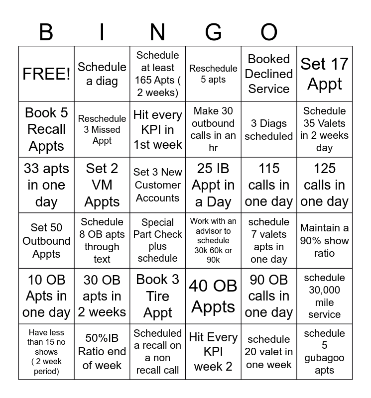 This bingo card has 36 words: 40 OB Appts, Book 3 Tire Appt, Hit Every KPI week 2, Book 5 Recall Appts, Set 50 Outbound Appts, 25 IB Appt in a Day, Reschedule 3 Missed Appt, Scheduled a recall on a non recall call, Booked Declined Service, 90 OB calls in one day, Schedule 35 Valets in 2 weeks day, Reschedule 5 apts, schedule 30,000 mile service, Set 2 VM Appts, Make 30 outbound calls in an hr, FREE!, 10 OB Apts in one day, 115 calls in one day, 33 apts in one day, Schedule at least 165 Apts ( 2 weeks), Set 3 New Customer Accounts, Schedule 8 OB apts through text, Work with an advisor to schedule 30k 60k or 90k, Special Part Check plus schedule, schedule 7 valets apts in one day, Schedule a diag, 3 Diags scheduled, 50%IB Ratio end of week, Hit every KPI in 1st week, Set 17 Appt, schedule 5 gubagoo apts, Have less than 15 no shows ( 2 week period), Maintain a 90% show ratio, 125 calls in one day, 30 OB apts in 2 weeks and schedule 20 valet in one week.