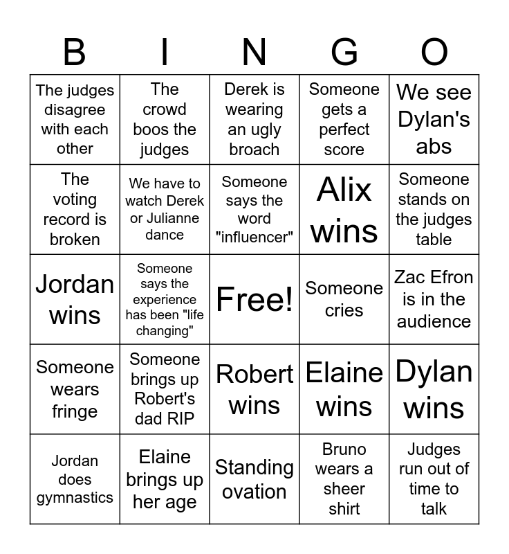 This bingo card has a free space and 24 words: Someone brings up Robert's dad RIP, Elaine brings up her age, Someone says the word "influencer", Jordan does gymnastics, We see Dylan's abs, The judges disagree with each other, The voting record is broken, The crowd boos the judges, Someone cries, Robert wins, Alix wins, Jordan wins, Elaine wins, Dylan wins, We have to watch Derek or Julianne dance, Bruno wears a sheer shirt, Zac Efron is in the audience, Derek is wearing an ugly broach, Someone stands on the judges table, Someone says the experience has been "life changing", Judges run out of time to talk, Someone wears fringe, Someone gets a perfect score and Standing ovation.