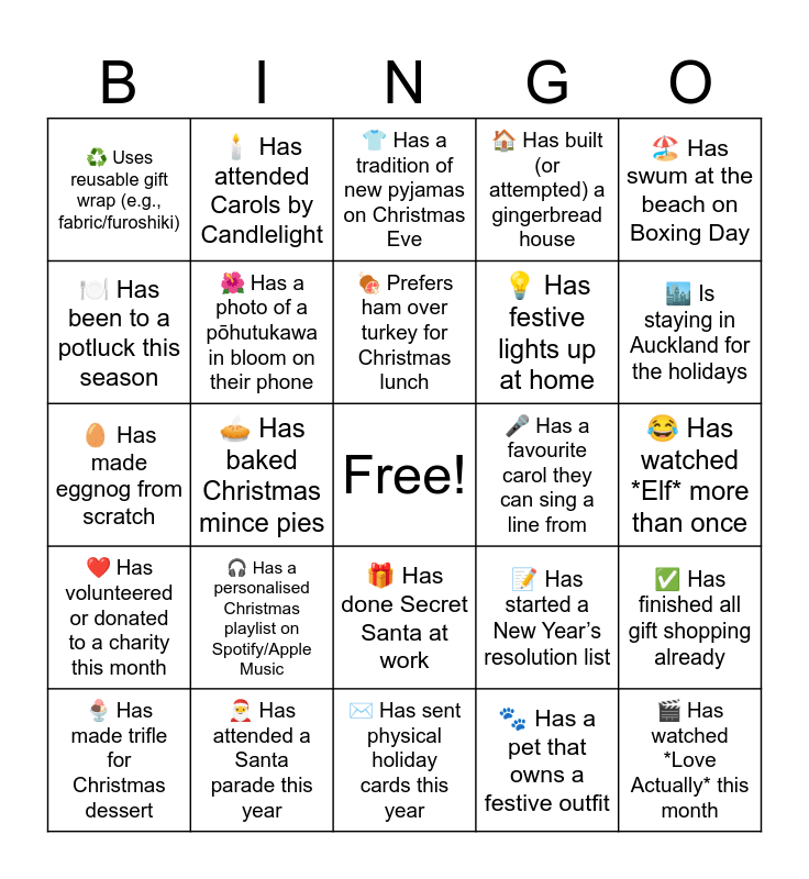 This bingo card has a free space and 41 words: π΅ Has had Mariah Carey βAll I Want for Christmas Is Youβ stuck in their head, π₯ Has made eggnog from scratch, π° Is going to make a pavlova this season, πΊ Has a photo of a pΕhutukawa in bloom on their phone, π Has attended a Santa parade this year, π Has done Secret Santa at work, π Prefers ham over turkey for Christmas lunch, π₯ Has barbecued on Christmas Day, ποΈ Has swum at the beach on Boxing Day, β€οΈ Has volunteered or donated to a charity this month, π₯§ Has baked Christmas mince pies, π Has built (or attempted) a gingerbread house, π¬ Has watched *Love Actually* this month, π Has watched *Elf* more than once, π€ Has a favourite carol they can sing a line from, π§ Has a personalised Christmas playlist on Spotify/Apple Music, β¨ Has decorated their desk or workspace, β»οΈ Uses reusable gift wrap (e.g., fabric/furoshiki), π Has reβgifted something (no judgement!), π Has a tradition of new pyjamas on Christmas Eve, β Has finished all gift shopping already, β³ Has left shopping until the day before christmas, βοΈ Has sent physical holiday cards this year, π‘ Has festive lights up at home, π² Has a real Christmas tree, π Has an artificial Christmas tree, πΎ Has a pet that owns a festive outfit, π Is travelling to see whΔnau over the break, ποΈ Is staying in Auckland for the holidays, π‘ Has planned a bach getaway, π Has watched the Boxing Day cricket (live or on TV), π―οΈ Has attended Carols by Candlelight, π¨ Has made trifle for Christmas dessert, π Has cracked a Christmas cracker and read the joke aloud, π Has started a New Yearβs resolution list, π½οΈ Has been to a potluck this season, π©βπ³ Has a secret family recipe for a holiday dessert, πΊοΈ Has a favourite summer holiday spot in Aotearoa, π Has worn a Christmas-themed outfit to work, π€ Has sung karaoke to a holiday song and π Has tried making homemade Christmas crackers.