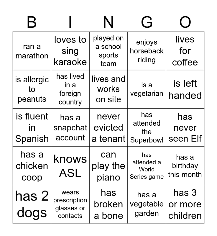 This bingo card has a free space and 25 words: knows ASL, has broken a bone, lives and works on site, has 2 dogs, lives for coffee, ran a marathon, is allergic to peanuts, loves to sing karaoke, has attended the Superbowl, can play the piano, is a vegetarian, is fluent in Spanish, has attended a World Series game, has a birthday this month, has lived in a foreign country, drives an electric car, has never seen Elf, played on a school sports team, is left handed, has a snapchat account, has 3 or more children, wears prescription glasses or contacts, has a chicken coop, enjoys horseback riding and has a vegetable garden.