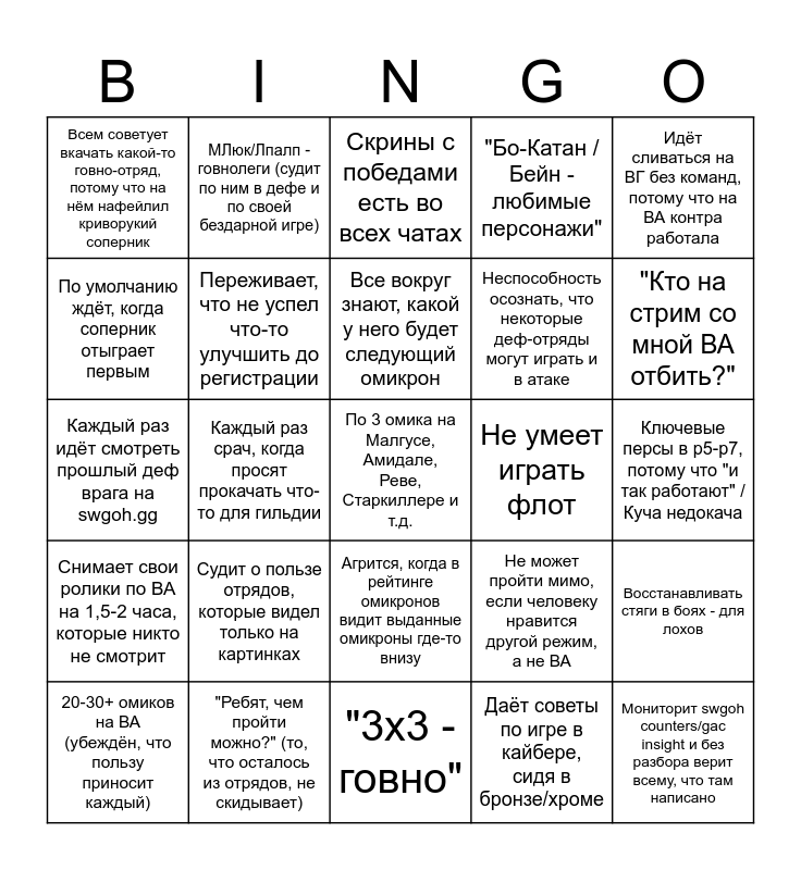 This bingo card has a free space and 29 words: 20-30+ омиков на ВА (убеждён, что пользу приносит каждый), Почти нет ВГ-омиков, Каждый раз срач, когда просят прокачать что-то для гильдии, "ВГ-говнорежим, потому что награды маленькие", Всем советует вкачать какой-то говно-отряд, потому что на нём нафейлил криворукий соперник, Скрины с победами есть во всех чатах, Переживает, что не успел что-то улучшить до регистрации, Судит о пользе отрядов, которые видел только на картинках, Не умеет играть флот, "Ребят, чем пройти можно?" (то, что осталось из отрядов, не скидывает), Ключевые персы в р5-р7, потому что "и так работают" / Куча недокача, Мониторит swgoh counters/gac insight и без разбора верит всему, что там написано, "3х3 - говно", Даёт советы по игре в кайбере, сидя в бронзе/хроме, "Кто на стрим со мной ВА отбить?", Смотрит Tassenix, Fatal и прочих топ-стримеров по ВА (их тактики для него просто неактуальны), Агрится, когда в рейтинге омикронов видит выданные омикроны где-то внизу, Снимает свои ролики по ВА на 1,5-2 часа, которые никто не смотрит, Идёт сливаться на ВГ без команд, потому что на ВА контра работала, Каждый раз идёт смотреть прошлый деф врага на swgoh.gg, Не может пройти мимо, если человеку нравится другой режим, а не ВА, Хуёвые результаты в рейде, Неспособность осознать, что некоторые деф-отряды могут играть и в атаке, По умолчанию ждёт, когда соперник отыграет первым, "Бо-Катан / Бейн - любимые персонажи", МЛюк/Лпалп - говнолеги (судит по ним в дефе и по своей бездарной игре), Восстанавливать стяги в боях - для лохов, Все вокруг знают, какой у него будет следующий омикрон and Пропадает из сети, когда проиграл.