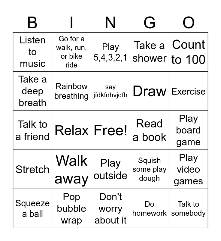 This bingo card has a free space and 24 words: Walk away, Pop bubble wrap, say jfdkfnhvjdfh, Squeeze a ball, Count to 100, Listen to music, Take a deep breath, Go for a walk, run, or bike ride, Read a book, Play outside, Draw, Talk to a friend, Squish some play dough, Play video games, Rainbow breathing, Do homework, Play board game, Play 5,4,3,2,1, Exercise, Relax, Talk to somebody, Stretch, Take a shower and Don't worry about it.