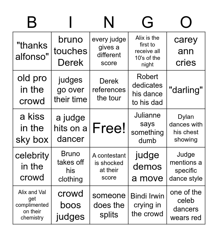 This bingo card has a free space and 24 words: Bruno takes off his clothing, crowd boos judges, Derek references the tour, Alix and Val get complimented on their chemistry, carey ann cries, "thanks alfonso", old pro in the crowd, bruno touches Derek, Julianne says something dumb, A contestant is shocked at their score, Robert dedicates his dance to his dad, a kiss in the sky box, judge demos a move, Judge mentions a specific dance style, judges go over their time, Bindi Irwin crying in the crowd, Dylan dances with his chest showing, every judge gives a different score, "darling", a judge hits on a dancer, one of the celeb dancers wears red, celebrity in the crowd, Alix is the first to receive all 10's of the night and someone does the splits.