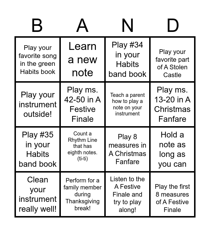 This bingo card has 16 words: Perform for a family member during Thanksgiving break!, Hold a note as long as you can, Play #34 in your Habits band book, Play your favorite song in the green Habits book, Play #35 in your Habits band book, Learn a new note, Play 8 measures in A Christmas Fanfare, Listen to the A Festive Finale and try to play along!, Play your instrument outside!, Play ms. 42-50 in A Festive Finale, Clean your instrument really well!, Play your favorite part of A Stolen Castle, Count a Rhythm Line that has eighth notes.(ti-ti), Play ms. 13-20 in A Christmas Fanfare, Teach a parent how to play a note on your instrument and Play the first 8 measures of A Festive Finale.