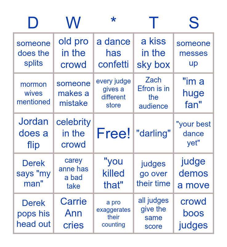 This bingo card has a free space and 47 words: Bruno takes off his clothing, crowd boos judges, bruno scores the wrong score, a pro exaggerates their counting, carey anne has a bad take, "thanks alfonso", old pro in the crowd, bruno climbs on derek, mormon wives mentioned, someone cries, someone makes a mistake, a kiss in the sky box, judge demos a move, judges go over their time, Robert's dad mentioned, tour gets mentioned, every judge gives a different store, "darling", a judge hits on a dancer, someone messes up, celebrity in the crowd, all judges give the same score, someone does the splits, Zach Efron is in the audience, Corey Feldman goes off the rails, "im a huge fan", Derek pops his head out, hip action is mentioned, "you killed that", Derek says "my man", Ezra makes a hand heart to the camera, someone wears a blue costume, "im so happy I got ___ as a partner", Elaine mentions her age, someone is shirtless, Carrie Ann cries, "your best dance yet", Tik Tok is mentioned, standing ovation, Bruno jumps out of his seat, a dance has smoke machine, a dance has confetti, Jordan does a flip, Parent Trap reference, Voting is mentioned more than 5 times, judges disagree and pro and star cry in their package.