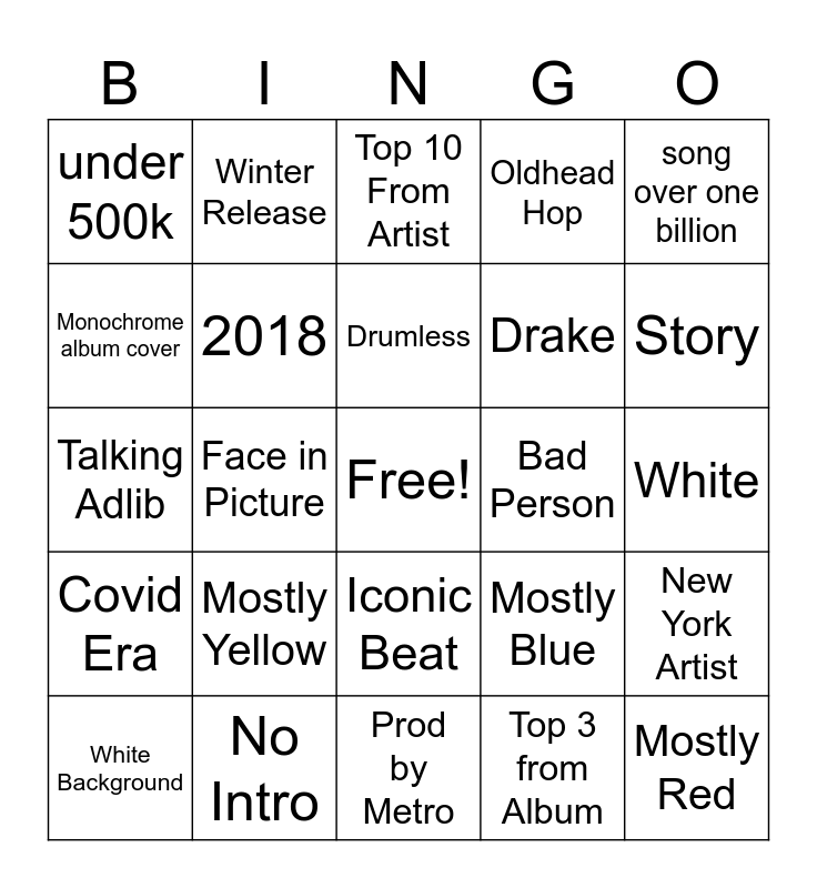 This bingo card has a free space and 24 words: Mostly Yellow, No Intro, Drumless, White Background, song over one billion, under 500k, Monochrome album cover, Winter Release, Bad Person, Iconic Beat, Drake, Talking Adlib, Mostly Blue, New York Artist, 2018, Top 3 from Album, White, Top 10 From Artist, Story, Face in Picture, Mostly Red, Covid Era, Oldhead Hop and Prod by Metro.