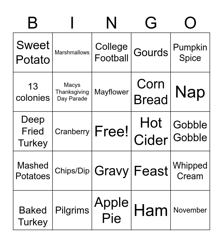 This bingo card has a free space and 29 words: Baked Turkey, Stuffing, Cranberry, Pumpkin Pie, Sweet Potato, College Football, Macys Thanksgiving Day Parade, Chips/Dip, Hot Cider, Pilgrims, Gobble Gobble, November, Apple Pie, Ham, Nap, Leftovers, Gravy, Mashed Potatoes, Pumpkin Spice, Deep Fried Turkey, Feast, Green Bean Casserole, Corn Bread, 13 colonies, Gourds, Marshmallows, Whipped Cream, Mayflower and 1492.