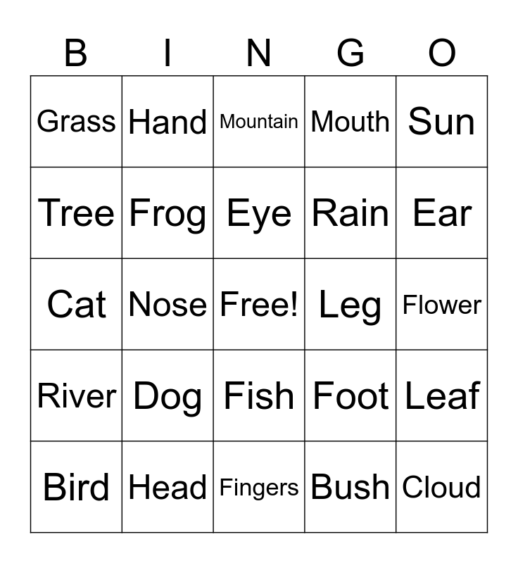 This bingo card has a free space and 24 words: Dog, Head, Eye, Bird, Sun, Grass, Tree, Hand, Leg, Fish, Rain, Cat, Foot, Leaf, Frog, Bush, Flower, Mountain, Ear, Nose, Cloud, River, Mouth and Fingers.