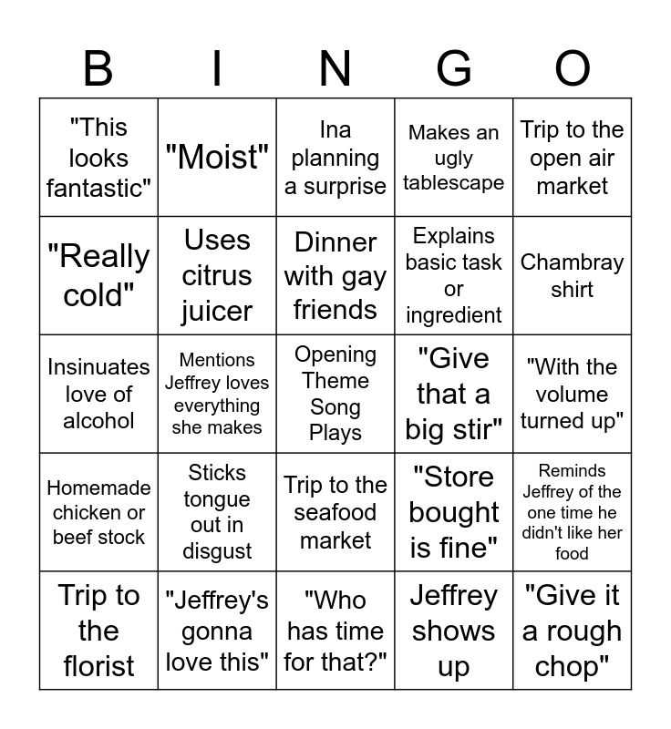 This bingo card has a free space and 34 words: Tries to normalize obscure dish, Jeffrey shows up, Dinner is outside, "Extra large eggs", Homemade chicken or beef stock, Uses citrus juicer, Trip to the open air market, Trip to the florist, "Moist", "How easy is that?", Dinner with gay friends, Ina planning a surprise, "How bad could that be?", "Good [insert ingredient]", "Give that a big stir", Chambray shirt, "Jeffrey's gonna love this", Insinuates love of alcohol, Sticks tongue out in disgust, "Store bought is fine", Trip to the seafood market, Mentions "Barefoot Contessa", "This looks fantastic", "With the volume turned up", "Who has time for that?", "Give it a rough chop", Makes an ugly tablescape, Drives in her convertible, Explains basic task or ingredient, "Really cold", "Who wouldn't love that?", Mentions Jeffrey loves everything she makes, Reminds Jeffrey of the one time he didn't like her food and Guests act surprised she cooks well.