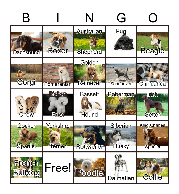 This bingo card has 24 images and 25 words: Yorkshire Terrier, Poodle, Golden Retriever, French Bulldog, Beagle, Dachshund, Corgi, Boxer, Doberman, Rottweiler, Schnauzer, Chow Chow, Siberian Husky, King Charles Spaniel, Pomeranian, Collie, Irish Setter, Australian Shepherd, Chihuahua, Bichon Frise, Bassett Hound, Free!, Cocker Spaniel, Pug and Dalmatian.