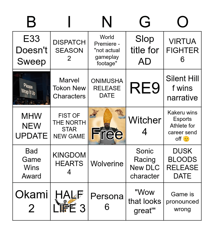 This bingo card has 2 images, a free space and 23 words: KINGDOM HEARTS 4, HALF LIFE 3, ONIMUSHA RELEASE DATE, Okami 2, VIRTUA FIGHTER 6, E33 Doesn't Sweep, DISPATCH SEASON 2, Witcher 4, Wolverine, RE9, MHW NEW UPDATE, Sonic Racing New DLC character, DUSK BLOODS RELEASE DATE, Marvel Tokon New Characters, "Wow that looks great'", Kakeru wins Esports Athlete for career send off 🫡, World Premiere - "not actual gameplay footage", Silent Hill f wins narrative, FIST OF THE NORTH STAR NEW GAME, Game is pronounced wrong, Bad Game Wins Award, Slop title for AD and Persona 6.