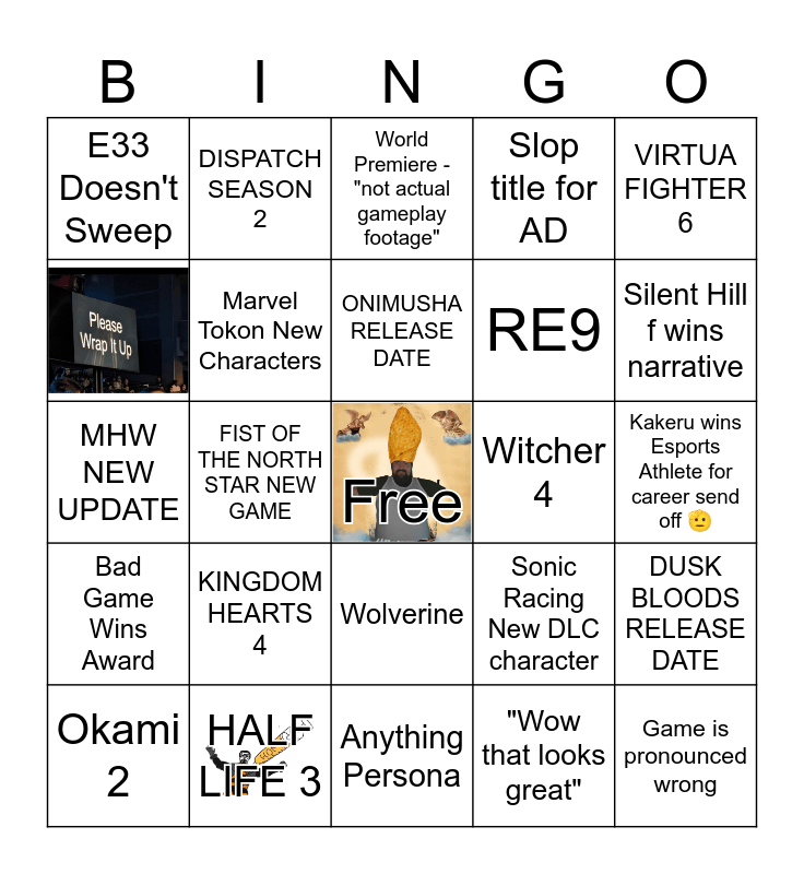 This bingo card has 2 images, a free space and 23 words: KINGDOM HEARTS 4, HALF LIFE 3, ONIMUSHA RELEASE DATE, Okami 2, VIRTUA FIGHTER 6, E33 Doesn't Sweep, DISPATCH SEASON 2, Witcher 4, Wolverine, RE9, MHW NEW UPDATE, Sonic Racing New DLC character, DUSK BLOODS RELEASE DATE, Marvel Tokon New Characters, "Wow that looks great", Kakeru wins Esports Athlete for career send off 🫡, World Premiere - "not actual gameplay footage", Silent Hill f wins narrative, FIST OF THE NORTH STAR NEW GAME, Game is pronounced wrong, Bad Game Wins Award, Slop title for AD and Anything Persona.