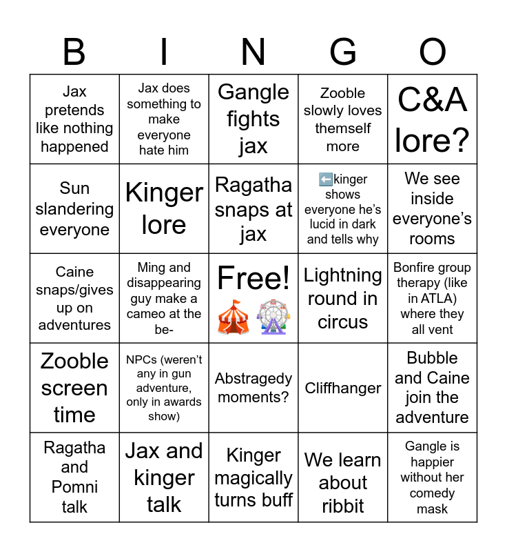 This bingo card has a free space and 34 words: Jax lore/flashback, We learn about ribbit, Pomni confronts jax, Gangle and zooble have a another heart to heart, Zooble screen time, Kinger lore, C&A lore?, Ragatha and Pomni talk, Jax does something to make everyone hate him, Jax depression arc, Ragatha snaps at jax, Gangle fights jax, An abstraction/more talk about abstraction, Jax wears a bikini, Lightning round in circus, We see inside everyone’s rooms, Jax and kinger talk, Caine snaps/gives up on adventures, NPCs (weren’t any in gun adventure, only in awards show), Cliffhanger, Abstragedy moments?, FunnyBunny divorce arc, Jax pretends like nothing happened, Bonfire group therapy (like in ATLA) where they all vent, Kinger magically turns buff, Gangle is happier without her comedy mask, Zooble slowly loves themself more, They spend the whole day at beach, even night to have bonfire, ⬅️kinger shows everyone he’s lucid in dark and tells why, Sun slandering everyone, Episode is not at all like my predictions, Ming and disappearing guy make a cameo at the be-, Bubble and Caine join the adventure and ANGST ANGST ANGST ANGST ANGST BABYYY.