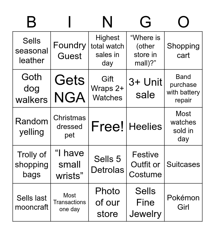 This bingo card has a free space and 46 words: CD player Girl, Pokémon Girl, “I’m from Michigan”, Photo of our store, “I have small wrists”, Quinceanera, Foundry Guest, Filson Watch Repair, Goth dog walkers, Dragging a Lego bag, Gets NGA, “Where is (other store in mall)?”, Suitcases, Festive Outfit or Costume, Sizes a watch, Monograms, Gift Wraps 2+ Watches, Heelies, Neck brace or cast, Shopping cart, Christmas dressed pet, Sells Fine Jewelry, Sells seasonal leather, 3+ Unit sale, 2+ watch sale, Band purchase with battery repair, Sells last mooncraft, Sells Red/Green watch, Sells 5 Detrolas, Trolly of shopping bags, See a Santa, Sells Ceramic, Sells a game set, Highest Daily sale, Highest AOV, Most Transactions one day, Most watches sold in day, Most transactions $495+, Highest SPH in 1 Day, Most journals sold in day, Most SLGs sold in day, Highest total watch sales in day, Random yelling, Mall event, “Smells good in here” and “Are those cigars?” (strap).