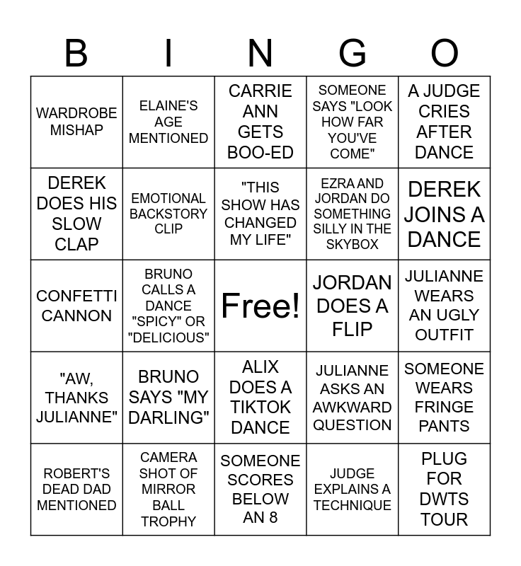 This bingo card has a free space and 34 words: SHIRT RIPPED OFF, JUDGE EXPLAINS A TECHNIQUE, BRUNO STANDS UP DURING COMMENTS, STANDING OVATION, "AW, THANKS JULIANNE", EMOTIONAL BACKSTORY CLIP, A JUDGE CRIES AFTER DANCE, ROBERT'S DEAD DAD MENTIONED, ELAINE'S AGE MENTIONED, JORDAN'S OLYMPIC CAREER MENTIONED, "THIS SHOW HAS CHANGED MY LIFE", CARRIE ANN GETS BOO-ED, CAMERA SHOWS A CELEBRITY IN THE CROWD, DEREK SAYS 'MY MAN' OR 'BROTHER', JORDAN DOES A FLIP, DEREK JOINS A DANCE, CAMERA SHOT OF MIRROR BALL TROPHY, CONFETTI CANNON, BRUNO SAYS "MY DARLING", JULIANNE ASKS AN AWKWARD QUESTION, ALIX DOES A TIKTOK DANCE, ZAC EFRON MENTIONED/SHOWN, WARDROBE MISHAP, JULIANNE WEARS AN UGLY OUTFIT, SOMEONE SCORES BELOW AN 8, PLUG FOR DWTS TOUR, SOMEONE SAYS "LOOK HOW FAR YOU'VE COME", SOMEONE WEARS A WIG, EZRA AND JORDAN DO SOMETHING SILLY IN THE SKYBOX, DEREK DOES HIS SLOW CLAP, CARRIE ANN COMPLAINS ABOUT A LIFT, BRUNO CALLS A DANCE "SPICY" OR "DELICIOUS", SOMEONE WEARS FRINGE PANTS and A JUDGE CRITIQUES A PRO.