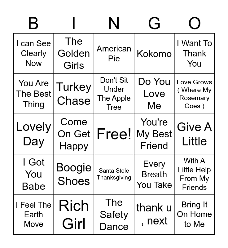 This bingo card has a free space and 64 words: GREENS BEANS POTATOES, ( Do THe) Mashed Potatoes, Thanksgiving Theme, With A Little Help From My Friends, Apple, Peaches , Pumpkin Pie, Cheeseburger In Paradise, The Golden Girls, We Are Family, Don't Sit Under The Apple Tree, Lets Turkey Trot, Santa Stole Thanksgiving, What A Wonderful World, Give A Little, I Want To Thank You, Memories, You Are The Best Thing, Come On Get Happy, I can See Clearly Now, Good Day Sunshine, Do You Love Me, Boogie Shoes, I Got You Babe, Kokomo, Cecilia, Signed, Sealed , Delivered( I’m yours ), You Make My Dreams ( Come Trues), Afternoon Delight, Lean On Me, Ain't No Mountain High Enough, Wouldn't It Be Nice, Where Everybody Knows Your Name, If You Wanna Be Happy, Stretchy Pants, December 1963 ( Oh What A Night ), Love Grows ( Where My Rosemary Goes ), I Feel The Earth Move, I'll Be There For You, thank u , next, Home, Turkey Chase, Lovely Day, You're My Best Friend, Count on Me, Friends In Low Places, Photograph, Bring It On Home to Me, Rich Girl, Thank you ( Falettinme Be Mice Elf Agin), Every Breath You Take, Fly Me To The Moon, You Know Im No Good, For Once In My Life, The Safety Dance, Cake By The Ocean, Jumpin’ Jack Flash, Escape ( The Pina Colada Song ), American Pie, Born To Run, Maybelline, Gratitude, Piano Man, Best Of My Love, Got To Get You Into My Life and Where You Lead.
