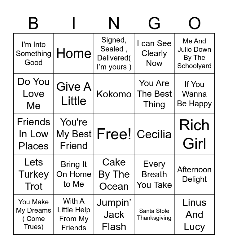 This bingo card has a free space and 60 words: Thanksgiving Theme, With A Little Help From My Friends, Don't Sit Under The Apple Tree, Lets Turkey Trot, Santa Stole Thanksgiving, What A Wonderful World, Give A Little, Memories, You Are The Best Thing, Come On Get Happy, I can See Clearly Now, Good Day Sunshine, Do You Love Me, Boogie Shoes, Feelin’ Alright, I'm Into Something Good, Linus And Lucy, Me And Julio Down By The Schoolyard, I Got You Babe, Kokomo, Cecilia, Signed, Sealed , Delivered( I’m yours ), You Make My Dreams ( Come Trues), Afternoon Delight, Lean On Me, Ain't No Mountain High Enough, Wouldn't It Be Nice, Where Everybody Knows Your Name, If You Wanna Be Happy, Stretchy Pants, December 1963 ( Oh What A Night ), Love Grows ( Where My Rosemary Goes ), I'll Be There For You, thank u , next, Home, Turkey Chase, Lovely Day, You're My Best Friend, Count on Me, Friends In Low Places, Photograph, Bring It On Home to Me, Rich Girl, Thank you ( Falettinme Be Mice Elf Agin), Every Breath You Take, Fly Me To The Moon, You Know Im No Good, For Once In My Life, The Safety Dance, Cake By The Ocean, Jumpin’ Jack Flash, Escape ( The Pina Colada Song ), American Pie, Born To Run, Maybelline, Gratitude, Piano Man, Best Of My Love, Got To Get You Into My Life and Where You Lead.