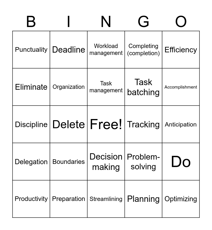 This bingo card has a free space and 34 words: Prioritization, Planning, Scheduling, Goal setting, Delegation, Organization, Efficiency, Productivity, Deadline, Focus, Task management, Workload management, Routines, Structure, Tracking, Accomplishment, Preparation, Discipline, Boundaries, Problem-solving, Decision making, Multitasking (avoiding or managing), Punctuality, Anticipation, Streamlining, Optimizing, Completing (completion), Time blocking, Task batching, Eliminate, Defer, Delete, Do and Reviewing.