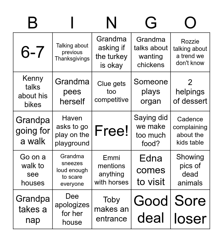 This bingo card has a free space and 24 words: Grandpa takes a nap, Grandma sneezes loud enough to scare everyone, Clue gets too competitive, Good deal, Rozzie talking about a trend we don't know, 6-7, Talking about previous Thanksgivings, Grandma asking if the turkey is okay, Saying did we make too much food?, Cadence complaining about the kids table, Grandpa going for a walk, Grandma pees herself, Edna comes to visit, Showing pics of dead animals, Kenny talks about his bikes, Dee apologizes for her house, Toby makes an entrance, Grandma talks about wanting chickens, 2 helpings of dessert, Go on a walk to see houses, Haven asks to go play on the playground, Emmi mentions anything with horses, Someone plays organ and Sore loser.
