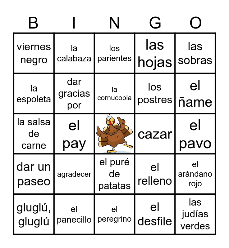 This bingo card has a free space and 24 words: agradecer, el panecillo, la cornucopia, gluglú, gluglú, las sobras, viernes negro, la espoleta, la calabaza, cazar, el puré de patatas, los postres, la salsa de carne, el relleno, el arándano rojo, dar gracias por, el desfile, el pavo, los parientes, el ñame, el pay, las judías verdes, dar un paseo, las hojas and el peregrino.