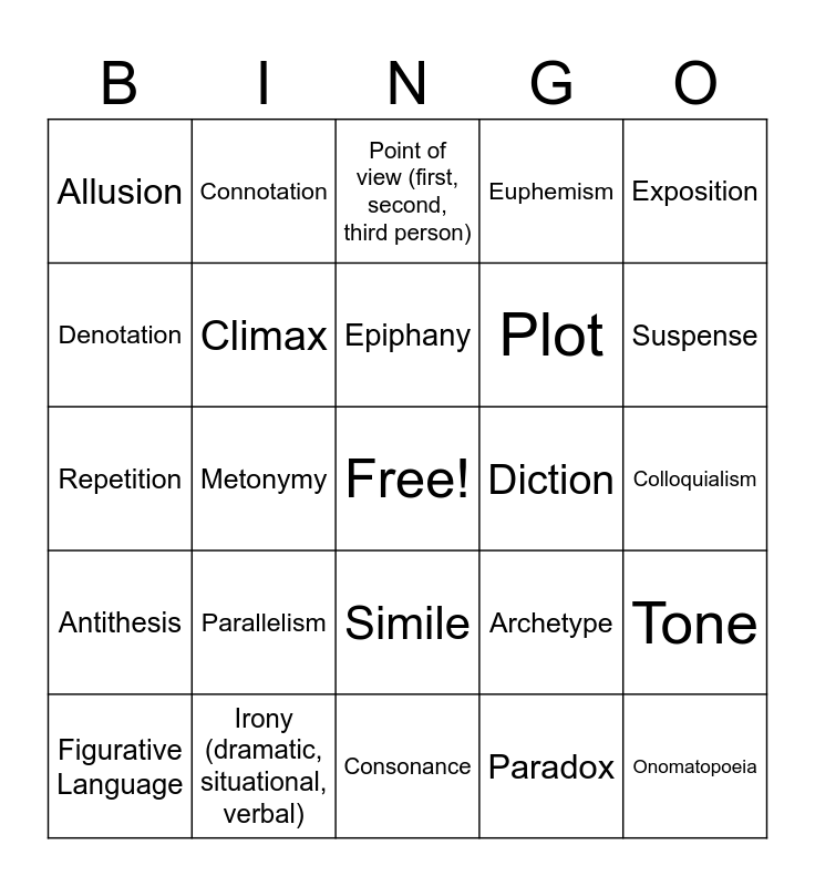 This bingo card has a free space and 73 words: Allegory, Alliteration, Allusion, Analogy, Anaphora, Antagonist, Antithesis, Aphorism, Archetype, Assonance, Atmosphere, Characterization, Climax, Colloquialism, Conflict, Connotation, Consonance, Denotation, Denouement, Diction, Epiphany, Euphemism, Exposition, Falling Action, Figurative Language, Flashback, Foreshadowing, Genre, Hyperbole, Imagery, Irony (dramatic, situational, verbal), Juxtaposition, Metaphor, Meter, Metonymy, Mood, Motif, Narrator, Onomatopoeia, Oxymoron, Paradox, Parallelism, Parody, Pathos, Personification, Plot, Point of view (first, second, third person), Protagonist, Pun, Repetition, Rhetorical question, Rhyme scheme, Rhythm, Rising Action, Satire, Setting, Sibilance, Simile, Soliloquy, Stanza, Stream of consciousness, Structure, Style, Suspense, Symbolism, Synecdoche, Syntax, Theme, Tone, Tragedy, Understatement, Verisimilitude and Voice.
